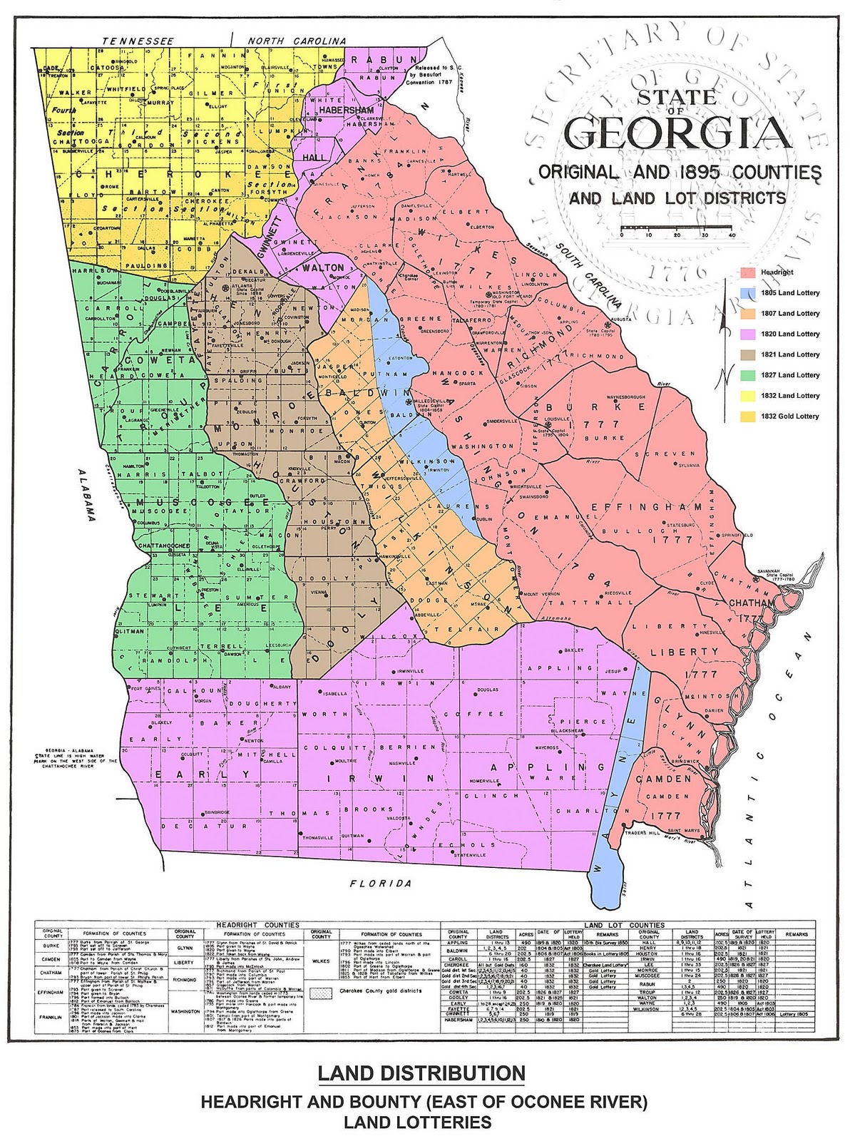 Like cutting an arm from their body, the solution was painful, but it erased the debts and kept the guns and cloth flowing. In a land-for-debt forgiveness swap, the Creek and Cherokee gave up all lands east of the Oconee and Altamaha Rivers, two and a half million acres. (Basically the red area on the map.)