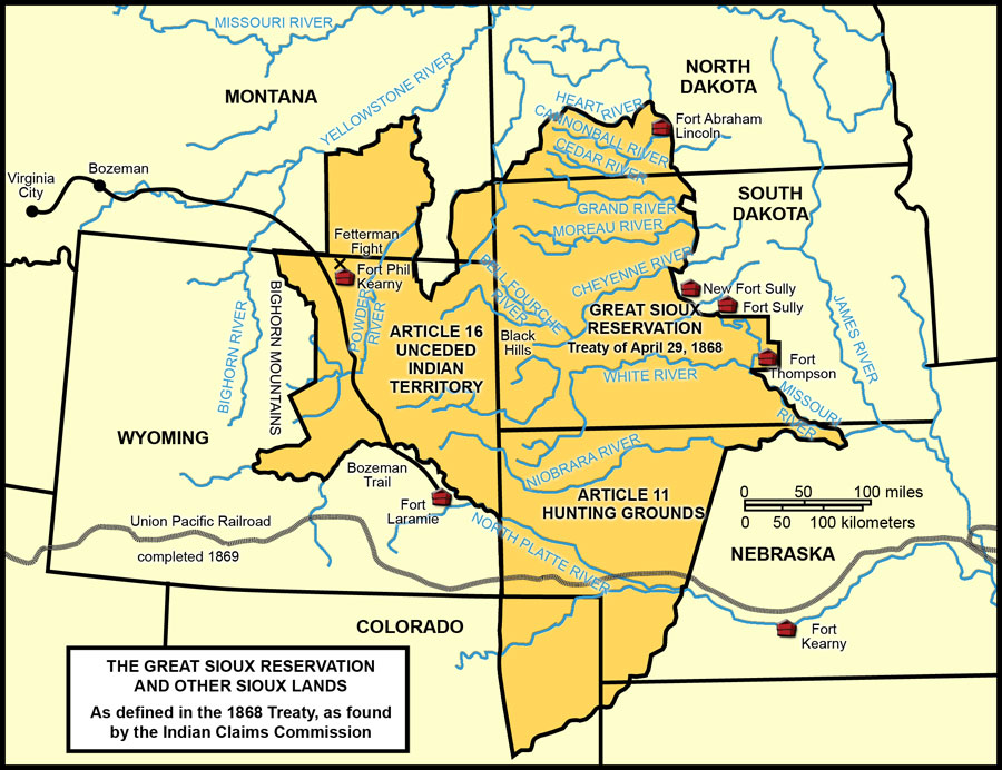 Eight years earlier, in 1868, the Great Sioux Reservation was “set apart for the absolute and undisturbed use and occupation of the Indians and no unauthorized person shall ever be permitted to pass over, settle upon, or reside in.” It included Paha Sapa, the Black Hills, sacred homeland of the Sioux, at its center.
