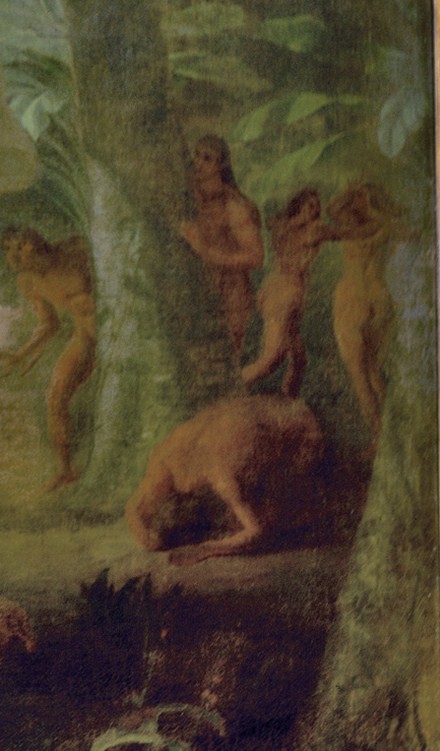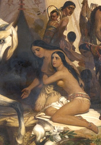 Of course, this is not the only sexual crime against Native Americans to be overlooked by history as told in the US. ISIS’s planning and management of the sex slaves is reminiscent Hernán Cortés’s conquest of Tenochitlán (Mexico City), in which he separated the attractive women from the unattractive, keeping the former for himself, but all of them were branded with a g for guerra. ISIS’s pamphlets providing theological justification for sex slavery are reminiscent of the debates in Spain at the Council of the Indies regarding the questionable human status of Native Americans. The kidnapping, rape, and impregnation of Pocahontas is another classic sexual assault, glossed over and re-written into a love story. Another 12′ x 18′ painting, this one of Pocahontas’s baptism, also while in captivity, hangs in the Capitol Rotunda. In addition to the obvious parallel theological need to Christianize one’s sexual partner (willing or unwilling), the Pocahontas saga recalls Boko Haram’s claims that the school girls they kidnapped have converted to Islam and been married off. There is yet another 12′ x 18′ foot painting in the Capitol Rotunda with Native Americans, this one showing Columbus landing in the Bahamas with naked Native women running through the forest (above). That makes three enormous paintings in the Capitol depicting naked or captive Native women. Congressmen condemning ISIS for their sex slavery walk past these every day. It is right to condemn ISIS, but De Soto deserves a mention. He, too, developed a theology of rape and employed it for several years across the American South.