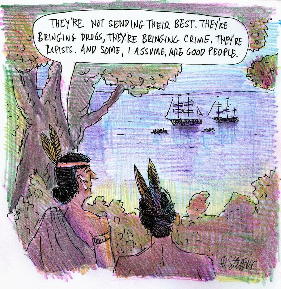 A great way to contextualize Trump’s “Mexican Speech!” I’ve seen the argument with slogans like “Who’s the illegal immigrant here, pilgrim!?” In Germany, though, nationalists, racists, and xenophobes use Indian imagery and the traditional German fascination for Native Americans to profit from the current refugee crisis, using slogans such as “The Indians couldn’t stop immigration. Now they live on reservations.” By this, they follow in the tradition of the Nazis to portray Germans as an Indigenous people that is endangered by alien incursions. German Neonazis are actually saying “Our only chance for survival as a people is by being racists or we Germans will have the same fate as the Indians.” Co-victimization and distorted historical comparison at its best.