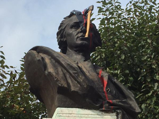 In an artistic display of rebellion, a statue of Christopher Columbus in Detroit (the old French fort between the Haudensaunee Confederacy and the Anishinaabe) was decorated with an ax to the forehead, complete with fake blood.