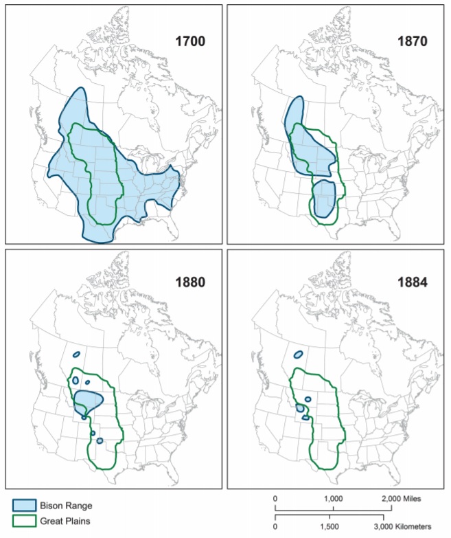 Figure 1.1 in Cunfer and Waiser (2016). The contracting range of American bison, adapted from Hornaday’s 1889 map.